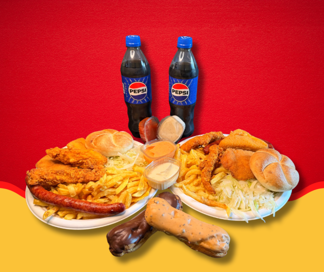2 Meniuri Mixte (2 snitele, 2 crispy, 2 carnati de gratar, 2 bucati de cascaval pane, 4 sosuri, 2 salate de varza , 2 chifle)